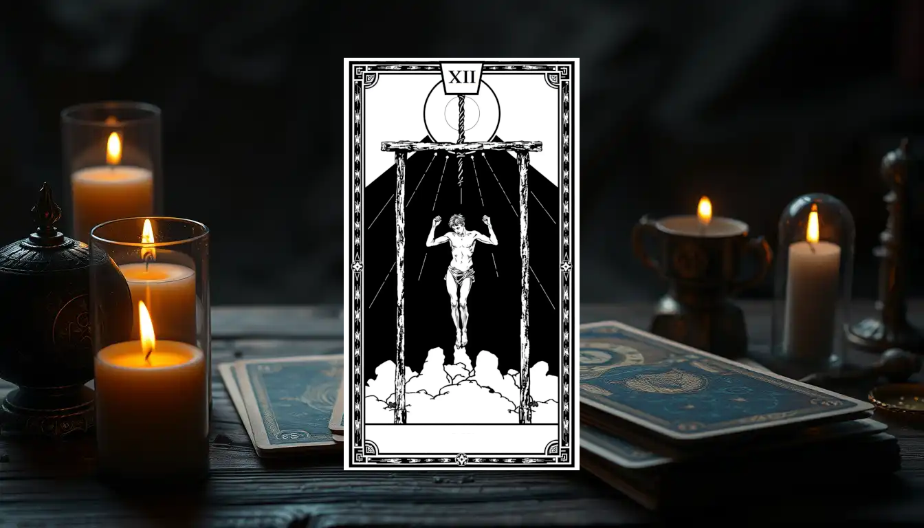 Présentation de la lame Le Pendu (XII) est suspendu par un pied, tête en bas, auréolé de lumière. Il semble…