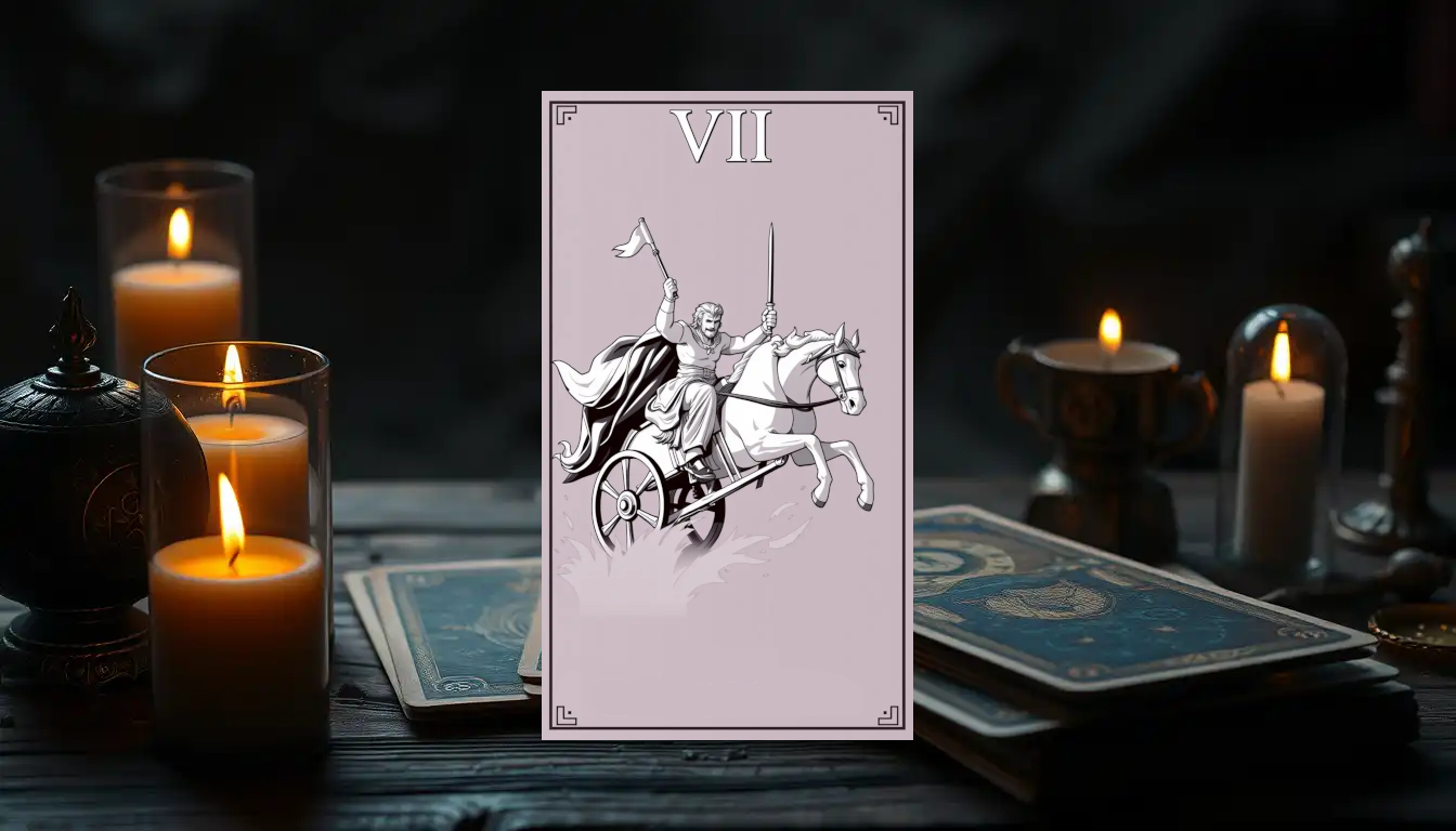 Présentation de la lame Le Chariot (VII) montre un prince triomphant dans son char tiré par deux sphinx de couleurs…